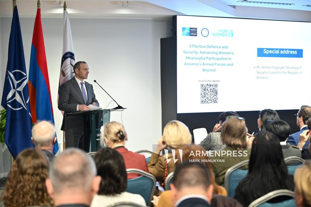 Այս մասին յայտարարած է ՀՀ Անվտանգութեան խորհուրդի քարտուղար Արմէն Գրիգորեան՝ «Արդիւնաւէտ պաշտպանութիւն եւ անվտանգութիւն. կիներու նշանակալի մասնակցութեան խթանումը Հայաստանի զինեալ ուժերուն մէջ եւ անկէ դուրս» բնաբանով միջազգային համաժողովի ընթացքին։